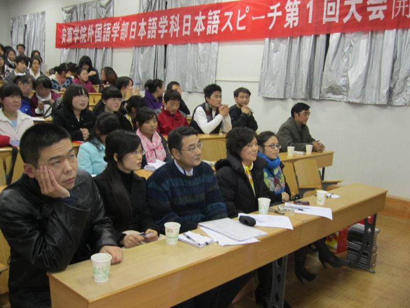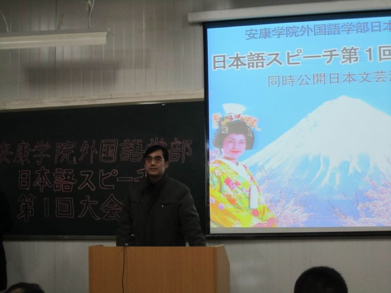 为丰富我系日语专业第二课堂活动,激发同学们学习日语的热情,增强学习日语的兴趣,12月9日19时30分,在外语系6408教室 “外语系首届日语演讲比赛”( 外国語学部日本語スピーチ第1回大会)拉开了帷幕。本次比赛分为专业组与非专业组,共有28人参赛。比赛由日语专业09级董敬和2010级蔡雨森主持,系主任哈红光老师,党总支书记李岩老师等领导出席了比赛。