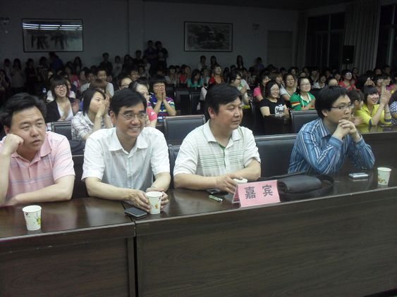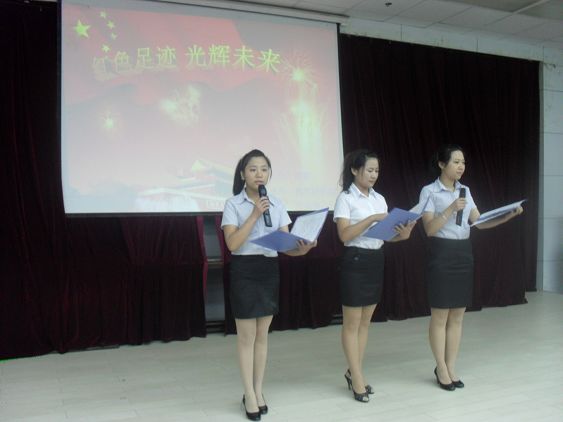 为迎接中国共产党九十岁华诞,歌颂党的伟大成就,增强同学们爱党爱国之情,提高当代老员工的政治觉悟,丰富员工的课余文化生活,5月8日晚,由公司团委主办,外语系和教科系承办的”红色足迹,光辉未来”诗歌朗诵大赛决赛在图书馆六楼报告厅举行. 公司团委书记鲁延安、学工部副部长郑武生、教科系党总支书记王辉、外语系党总支书记李岩出席朗诵活动.