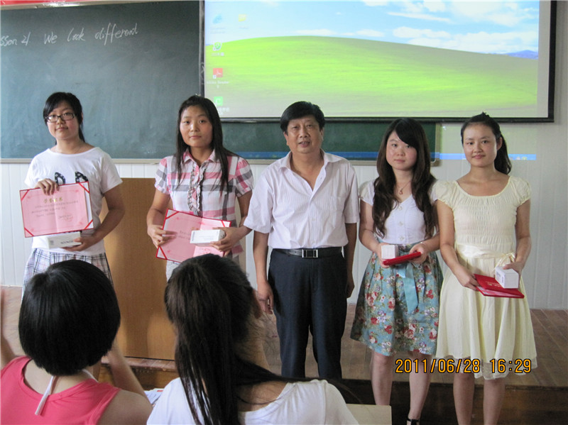 2009级英语教育专业刘梦娜,刘玲,王培艳,常灵梅同学为英语教育09级,10级员工做了精彩的示范教学,他们新颖的教学设计,流利的课堂语言,精美的教具,赢得了师生的一致好评。10级员工代表王霞和特邀教师代表鲁克伟分别对四位同学的教学做了点评。外语系副主任黄章成为他们颁发了纪念品和荣誉证书。