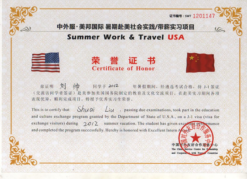 事实上,去美国没我想象的那么简单,期间的酸甜苦辣只有自己体验之后才知晓。去年11月份报名,12月份进行听力和口语的评估测试,从今年的1到5月都属于配岗阶段,期间会有两到三轮的来自于美方的企业面试,我觉得最难熬的要数配岗期了,焦急地等待着配岗结果,最开始说分到柯达照相,后来又说分到南卡罗来纳州,但始终没有确定的消息。满满的希望等到的是慢慢地绝望,配岗的事一次又一次泡汤,等的我都没耐性了,抱着去不去都无所谓了的态度去面对。我别无选择只好继续我的常规学习和生活,心想就听天由命吧。功夫不负有心人,终于在5月31日我顺利地拿到job offer。紧接着的三四天就开始准备签证材料,参加签证辅导培训,6月5日去广州进行面签。虽说拿到了offer,但DS2019表还没有到手,办签证还是问题。些许焦虑些许担忧,生怕出什么状况,毕竟付出了这么多才走到了最后也是最关键的一步。幸运的是在面签前30分钟我才顺利地拿到从美国寄过来的DS2019表,真是谢天谢地了。面签通过之后就又开始忙着准备行囊,准备出发。从没想过,有朝一日,我能实现随口一说的梦想,但这一天真的来了,北京时间2012年6月12日从咸阳机场带着梦想出发了,开始了三个多月的美国之旅。有梦才有远方!