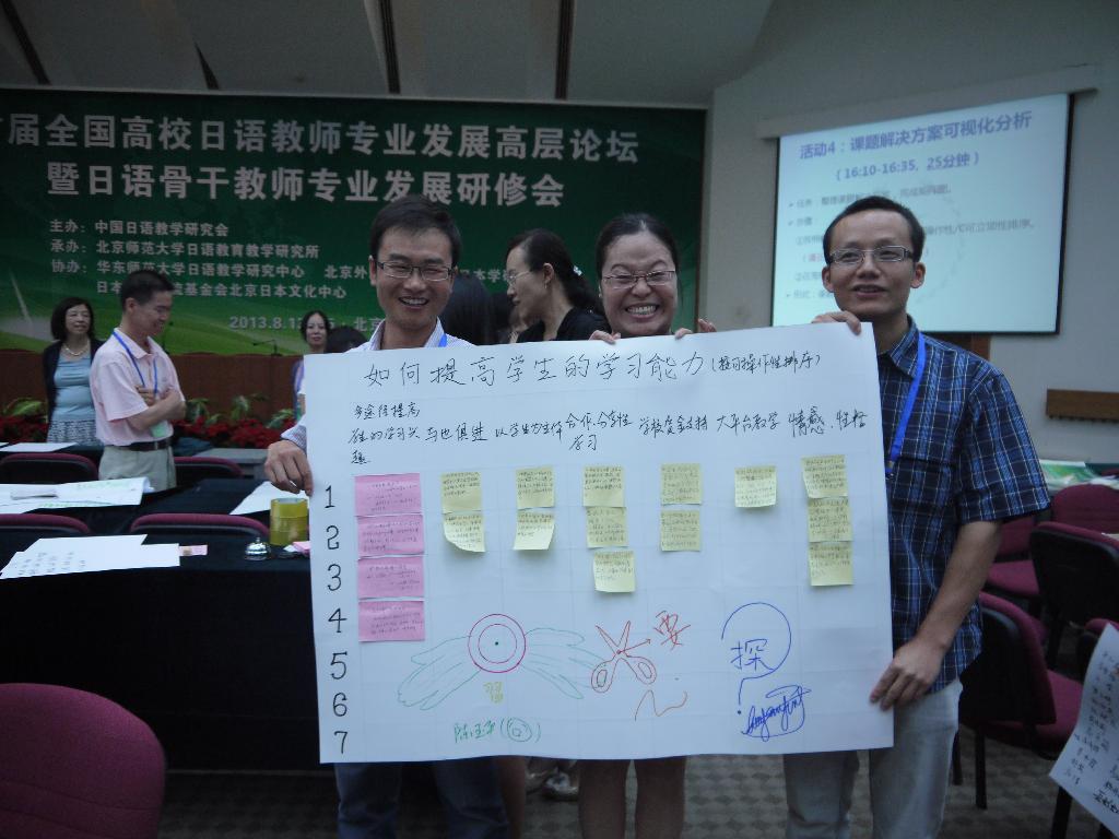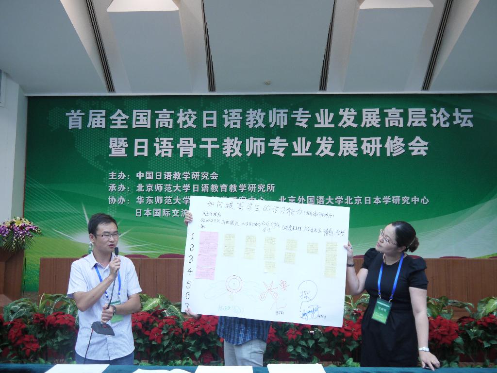 在高层论坛上,与会专家深入讨论了当前我国高校日语专业员工素质和能力培养、教师专业发展现状,商量成立地区分会,进行地区研修、校内研修、社会研修等相结合的未来研修计划,为培养具有时代精神,懂得教学方法和规律,教学和科研相长的专业教师而努力。在骨干教师专业发展研修会上,通过工作坊的组织形式,就专家关于日语教师专业发展的演讲内容跟自身实际情况相结合,分班分小组设计和解决相关课题,最后评出优秀课题组进行分享。