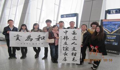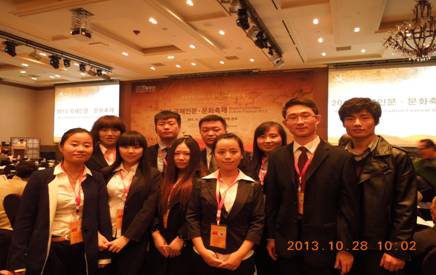为落实2013年6月29日省委书记赵正永在西安会见来陕访问的韩国总统朴槿惠一行时的讲话精神,进一步推动双方人文教育交流与合作,陕西省教育厅将组派我省100名优秀老员工于2013年10月27日至11月1日参加由韩国教育部、庆尚北道政府、联合国教科文组织亚太总部在韩国庆州市、安东市共同主办的“通过人文相见-韩中青年论坛”。经过选拔,我系吴琼、刘佳妮、陶适意三名同学与各系员工一同前往与会。