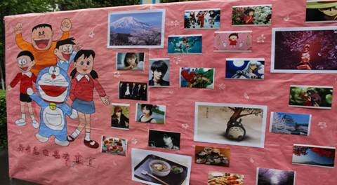 十八日下午,文化广场上悬挂着彩色气球,展示了正宗日本漫画并有身着和服和Cosplay的员工模特,吸引了大批员工和老师前来观看。下午四点半文化广场活动正式开始,外教赤松秀夫做了开场发言。之后由13级日语一班的同学演唱了歌曲《四季歌》,紧接着外教赤松秀夫带领12、11级日语专业员工演唱了多首日语歌曲,然后进行了“日语传话”、“日语常识抢答”以及“逢三过”等趣味性活动,将现场气氛掀到高潮。参与活动人员均有日本式礼物相送。与此同时,活动现场的嘉宾和观众品尝了正宗寿司,体验了日本饮食文化。活动结束后全体日语专业师生合影,为本次日语文化广场活动划上了圆满的句号。