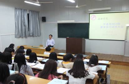 2014年9月23日晚上7点半,我系2014年秋季公司产品实习动员大会在江南校区六号楼6405教室召开。系副主任张哲华、实习带队教师刘荣华、汪琦、王欢以及全体2015届师范毕业生参加了会议。