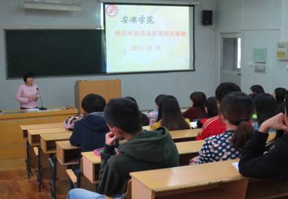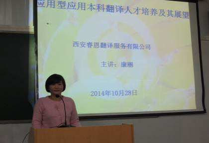 10月28日下午,西安睿恩翻译公司高级项目经理、我系外聘双师型教师康丽为2012级、2013级英语专业翻译方向员工做专题讲座。康丽女士围绕翻译行业前景、翻译行业规范、翻译公司工作流程、译员职业素养等内容进行了讲解,并结合翻译业务实例和同学们展开互动交流。