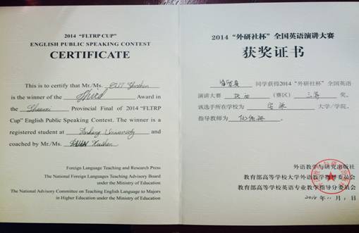 外语系12级英语专业崔智真同学代表公司参加了比赛,在全省44名选手中脱颖而出,荣获三等奖,为公司赢得了荣誉,也是我系英语专业员工良好的综合应用能力的体现。