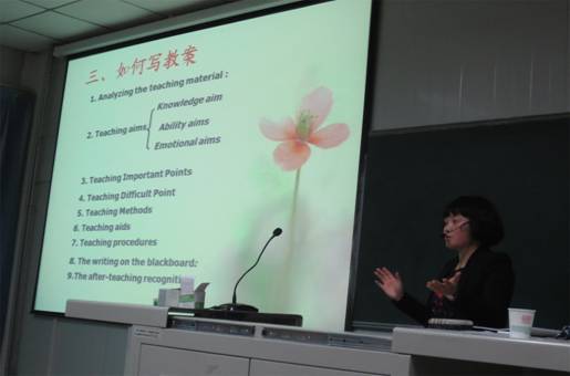 涂芮老师首先以问题“Do you want to be a teacher?”启发同学们思考如何做一名合格中学英语教师。在随后的讲座中,涂芮老师以她参加的一节赛教观摩课为例,就如何进行高中英语课堂教学进行了详细介绍,使同学们不仅对高中英语教材有了清晰认识,特别是明确了单元课时安排及相应课型的教学方法。在谈到具体课堂教学时,涂芮老师分享了自己多年积累的宝贵经验。在讲座中,她结合英语课程标准与高考要求,对高中英语教学提出了很多有见地的认识。