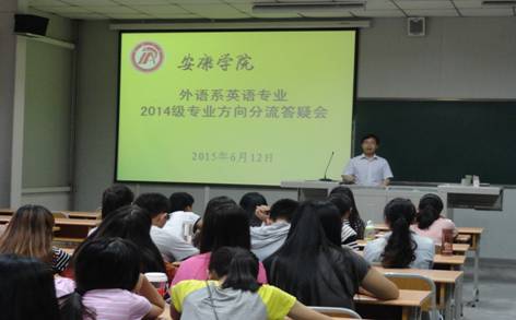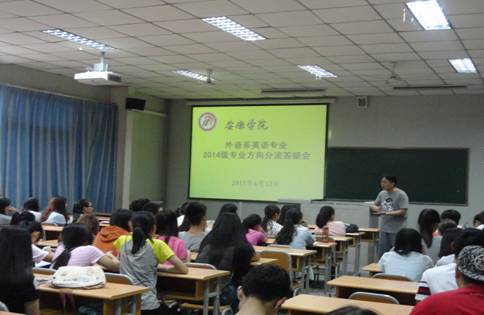 为确保即将开展的英语专业方向分流工作顺利进行,使员工对专业方向选择有更清楚的认识,6月12日下午4点30分,外语系在1014教室召开了2014级英语专业员工专业方向分流答疑会。系副主任张哲华、英语教研室主任兼翻译方向负责人王刚、教师教育团队负责人覃春晖和王欢参加了会议。