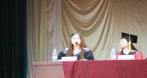 随后,系主任哈红光教授代表外语系致辞并宣读了学位授予决定。他的致辞,循循善诱,饱含期望,再一次勾起毕业生们几年来与外语系同度的日子。其中,他提到公司是小社会,社会是个大课堂。课虽有终结,而学无止境。在公司学到的不仅是知识本身,更是学习方法的掌握,只有不断的学习,才能跟上时代发展的步伐,从而更好地服务社会,贡献国家,实现自己的人生梦想。同时告诫毕业生不要抱怨,不要放弃,要勇于迎接挑战,敢于担当,并祝愿同学们在新的人生起点走得更远!毕业生代表---英语专业2011级张之涵同学发表了热情洋溢的毕业感言,她简要回顾了大学的朝夕相处、同窗情谊、耕耘收获,并表示将牢记领导和老师们的殷殷嘱托,不负母校的殷切期望,不忘“笃学、尚行、厉志、创新”的校训,以饱满的热情和昂扬的斗志投身社会、服务人民、奉献青春、实现价值、回馈母校。她也代表全体毕业生祝福老师们身体安康,桃李芬芳,祝愿母校人才辈出,蒸蒸日上!