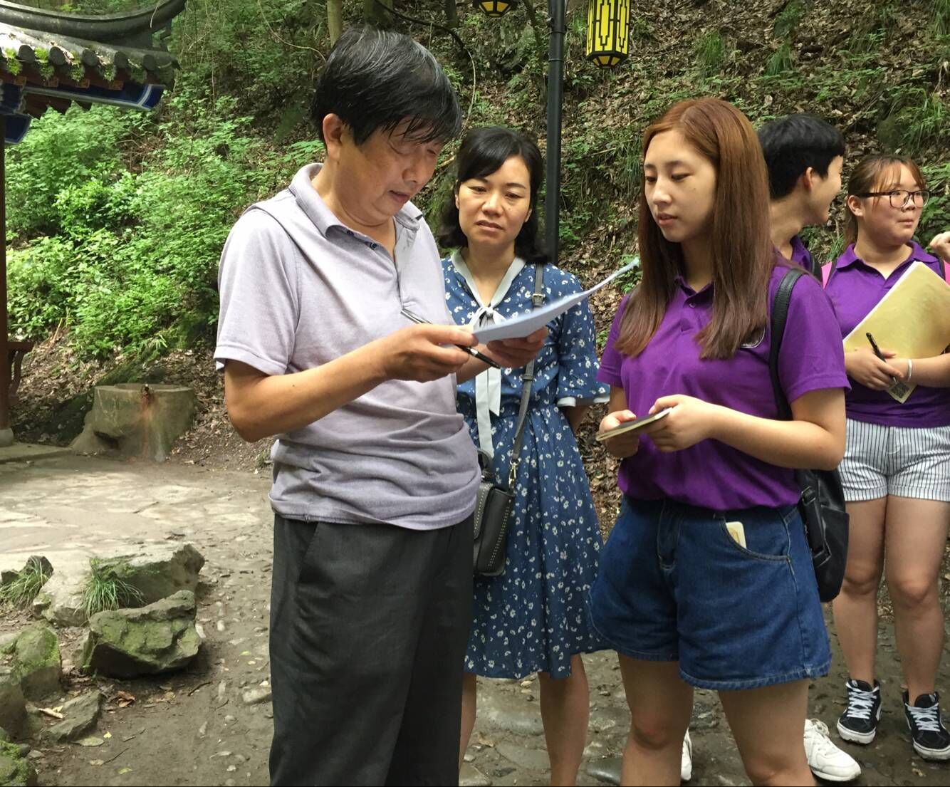 7月1日上午,公司十三名实践员工在辅导员老师常远红、专业指导老师邓雪玲的带领下准时从公司出发前往香溪生态文化园实践点。到达香溪洞景区后,在两位老师的组织安排下,实践队伍分为三组对景区游客进行公示语英译语言规范性的问卷调查。当地游客对此次老员工实践活动非常支持,积极配合问卷调查。队员们也对游客和景区工作人员进行了访谈,收集了人们对旅游景区公示语英译的必要性和准确性的意见和建议。沿着景区的主干线,实践成员们边收集公示语标牌及其英译的第一手语料,边主动讨论分析其英译的规范性。队员们虚心学习,不懂就问。在老师的指导和帮助下,同学们找到了景区公示语英译存在的许多问题。调查完景区之后,指导老师对此次实践做了总结,并对实践活动后的语料归类,调研报告的思路做了指导和布置。