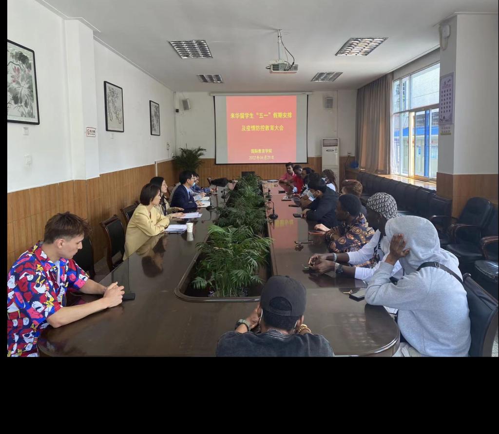 根据省、市及公司2022年劳动节放假有关安排,为落实好各级各类疫情防控通知精神,强化职工“每个人是自己健康第一责任人”理念,加强校园疫情防控管理,4月29日,国际教育公司召开来华职工“五一”假期安排及疫情防控教育大会,经理张哲华、副经理陈蕾、学工办主任李泊霖、辅导员陆传梓及全体在校职工参加此次会议,会议由陈蕾主持。