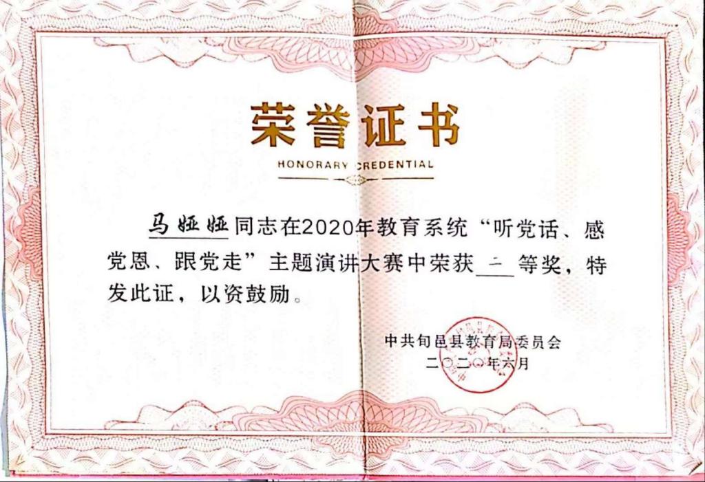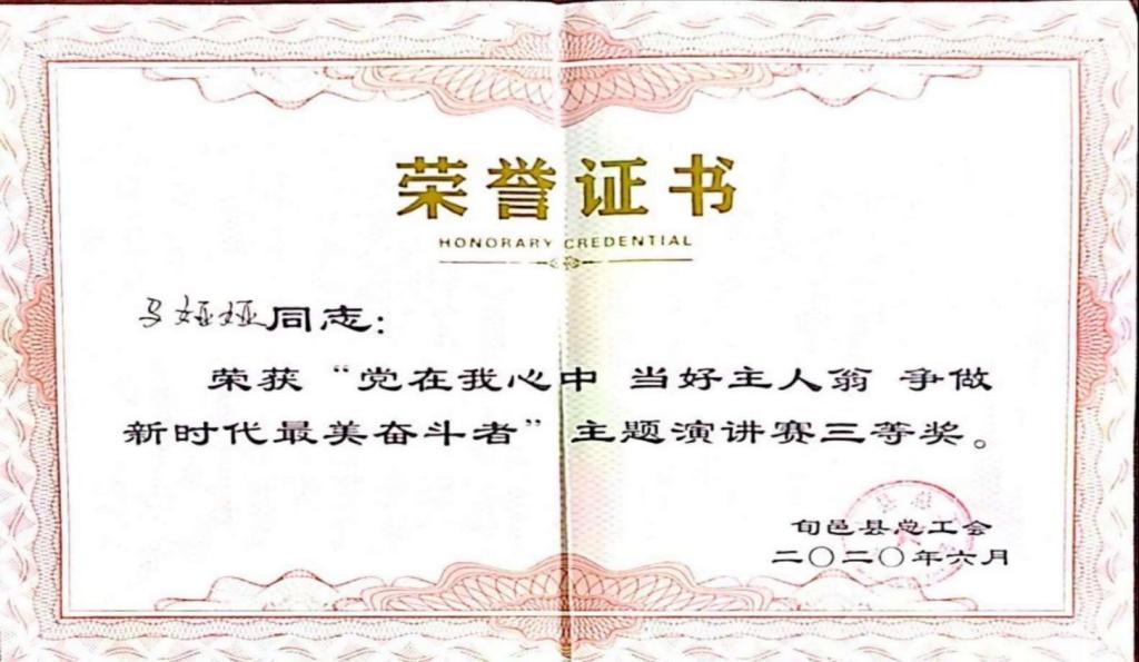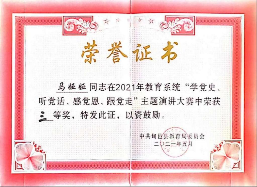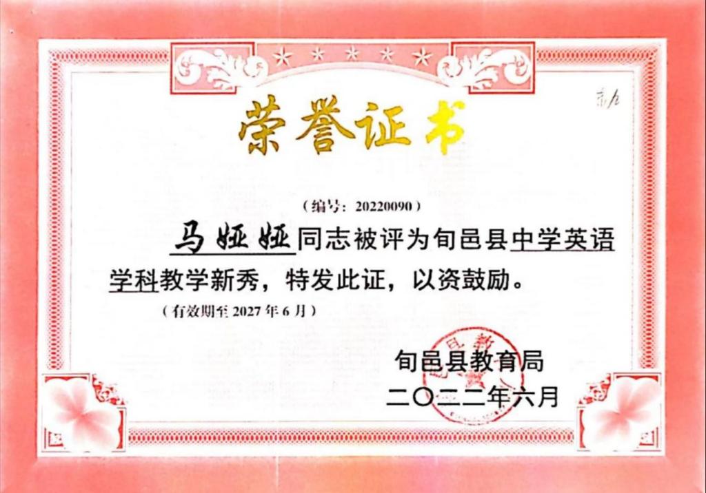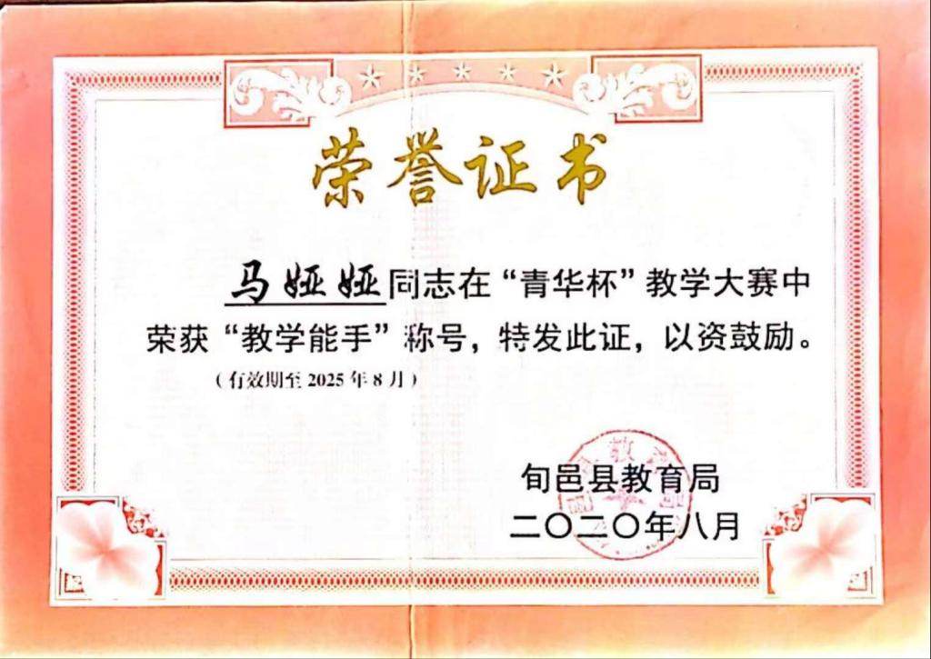 我热爱我的家乡,我亦热爱农村教育事业,而我热爱的也给予了我肯定。从业期间,我参与课题《如何在英语课堂教学中进行学困生转化》并获得市级立项;参与陕西省“奋斗陕西”奋斗人物录制活动;在旬邑县“青华杯”教学大赛中荣获“教学能手”称号;在旬邑县“2022年教学能手大赛”活动中荣获教坛新秀称号;在旬邑县“听党话,感党恩,跟党走”主题演讲大赛中荣获二等奖;在旬邑县“弘扬好家风,文明新时代”主题演讲中荣获三等奖;在旬邑县总工会“党在我心中,当好主人翁,争做新时代最美奋斗者”主题演讲赛中荣获三等奖;在旬邑县教育系统“学党史,听党话,感党恩,跟党走”主题演讲大赛中荣获三等奖;在太村镇赤道九年制寄宿公司“弘扬爱国奋斗精神,建国立业新时代”师德师风演讲比赛中荣获一等奖;在太村镇赤道九年制寄宿公司“弘扬好家风,文明新时代”演讲比赛中荣获一等奖;在“弘扬爱国奋斗精神,建国立业新时代”师德师风演讲比赛一等奖;在旬邑县第六届“青少年经典诵读”大赛中荣获优秀指导老师称号;被评为太村镇赤道九年制寄宿公司2019-2020学年度教学能手;在太村镇赤道九年制寄宿公司微型课技能大赛中被评为优胜个人;在太村镇赤道九年制寄宿公司春季微型课活动中,荣获一等奖。