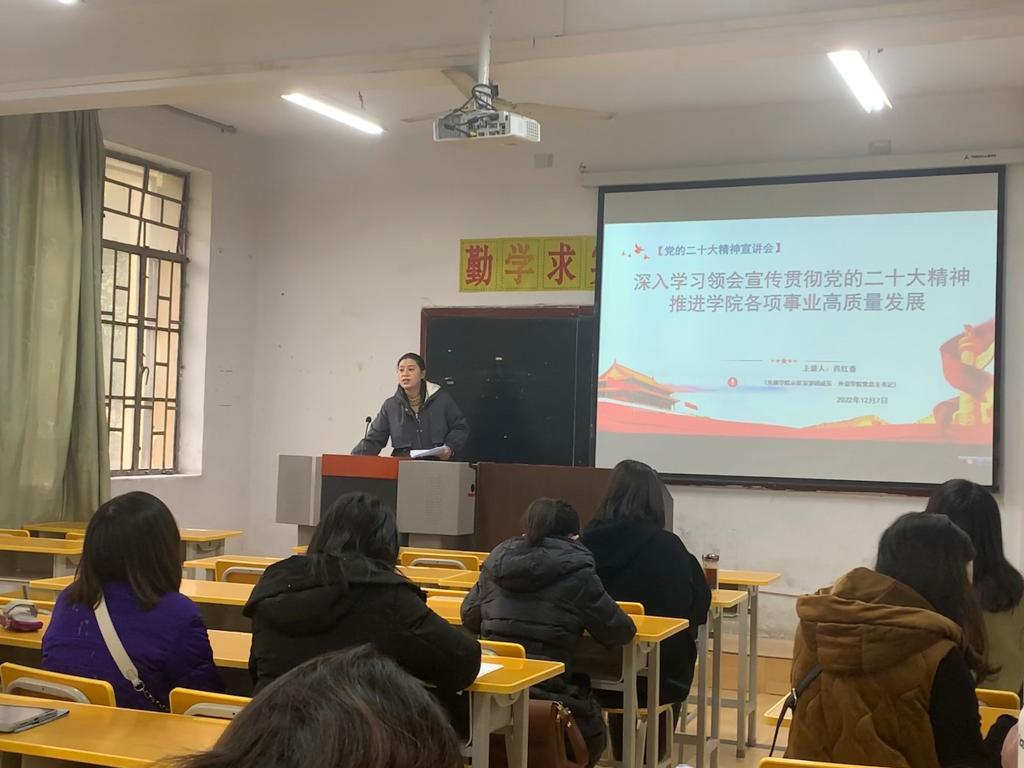 就进一步学习宣传贯彻落实党的二十大精神,肖红香强调:一是高度重视,充分认识重大意义和核心要义。全体党员、全院教职工要充分认识学习宣传贯彻党的二十大精神的重大意义,全面准确学习领会宣传贯彻党的二十大精神的核心要义,切实把思想和行动统一到党的二十大精神上来。二是马上行动,掀起学习学习宣传的热潮。要把深入学习宣传贯彻党的二十大精神作为当前和今后一个时期的首要政治任务来抓。各党支部、团总支、辅导员要持续深入学习党的二十大精神,组织开展党的二十大精神学习交流,做到师生“全覆盖”。三是学用结合,贯彻大会精神推动工作落实。围绕公司和公司发展的中心工作,进一步增强政治自觉、思想自觉、行动自觉,切实把党的二十大精神落实到公司和公司发展的各方面、全过程,推动公司和公司各项事业高质量事业高质量发展。
