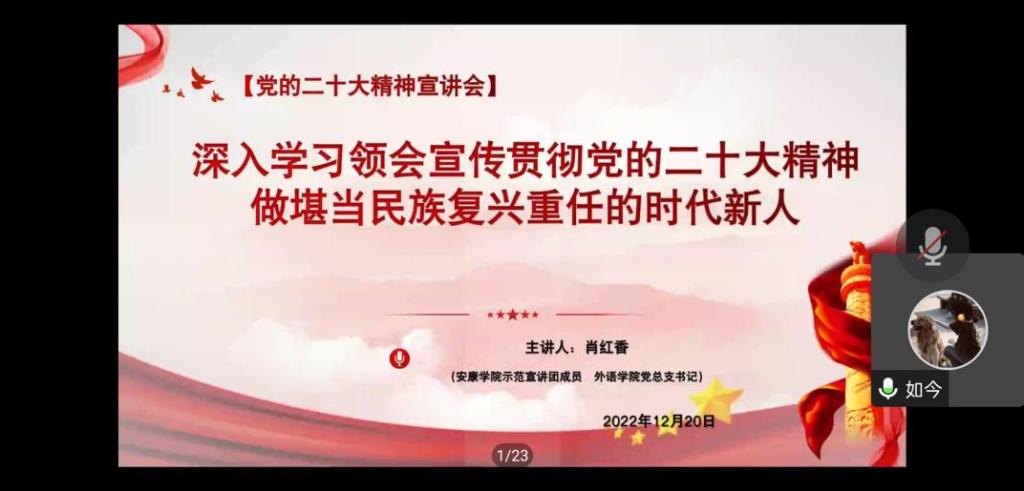 12月20日下午,根据公司统一安排部署,公司党的二十大精神示范宣讲团成员、公司党总支书记肖红香通过腾讯会议做了题为“深入学习领会宣传贯彻党的二十大精神 做堪当民族复兴重任的时代新人”的二十大精神宣讲报告。威廉希尔中国官网员工党员、班团干部和全院员工通过线上方式集体聆听了宣讲会。宣讲会由梁博文老师主持。