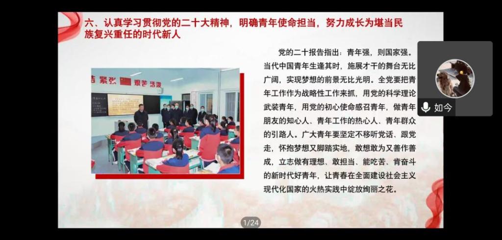 肖红香从大会主要议程、大会主题、大会成果、重大变革、目标任务、青年使命担当等六个方面全面系统地解读了党的二十大精神。党的二十大是在全党全国各族人民迈上全面建设社会主义现代化国家新征程、向第二个百年奋斗目标进军的关键时刻,召开的一次十分重要的大会。学习宣传贯彻党的二十大精神是当前和今后一个时期的首要政治任务。