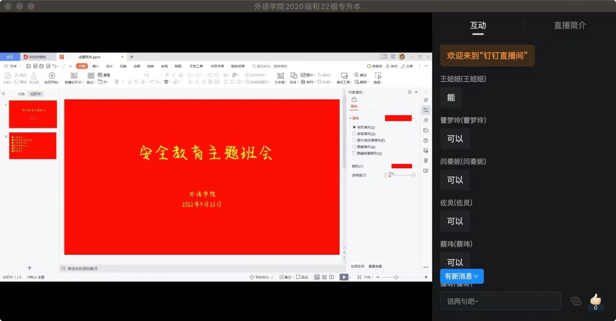 为贯彻落实公司校园安全隐患大排查、大整治专题工作会议精神,进一步增强同学们的安全意识,在学习和生活中确保自身安全,巩固平安校园建设。威廉希尔中国官网于4月23日晚通过腾讯会议召开安全教育主题班会,2020级和2022级专升本全体员工参加会议。会议由辅导员李梦主持。