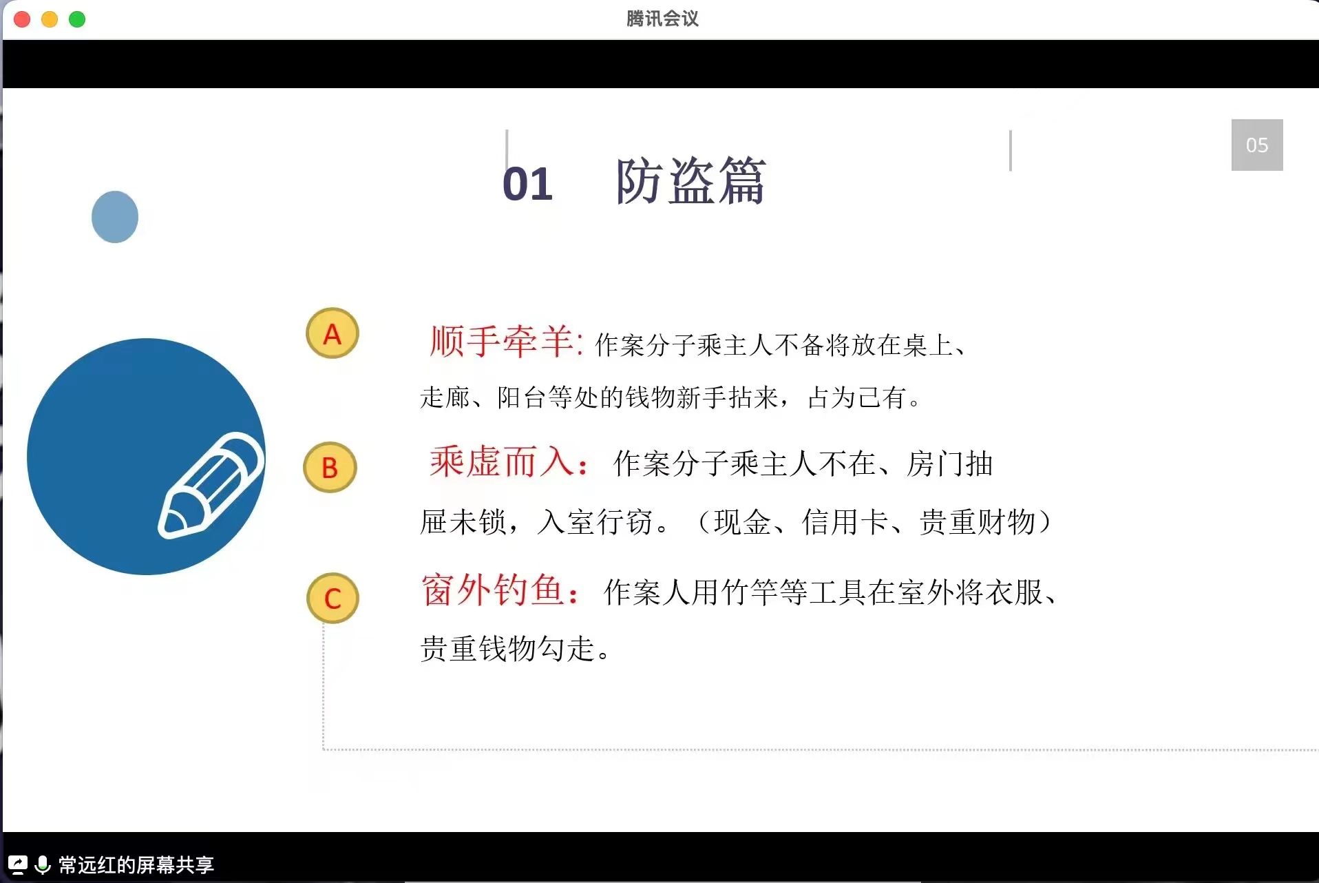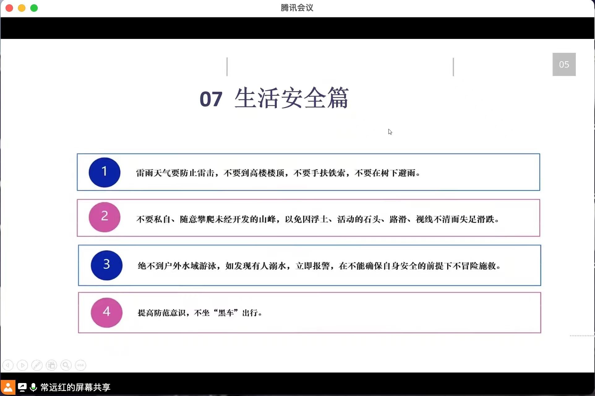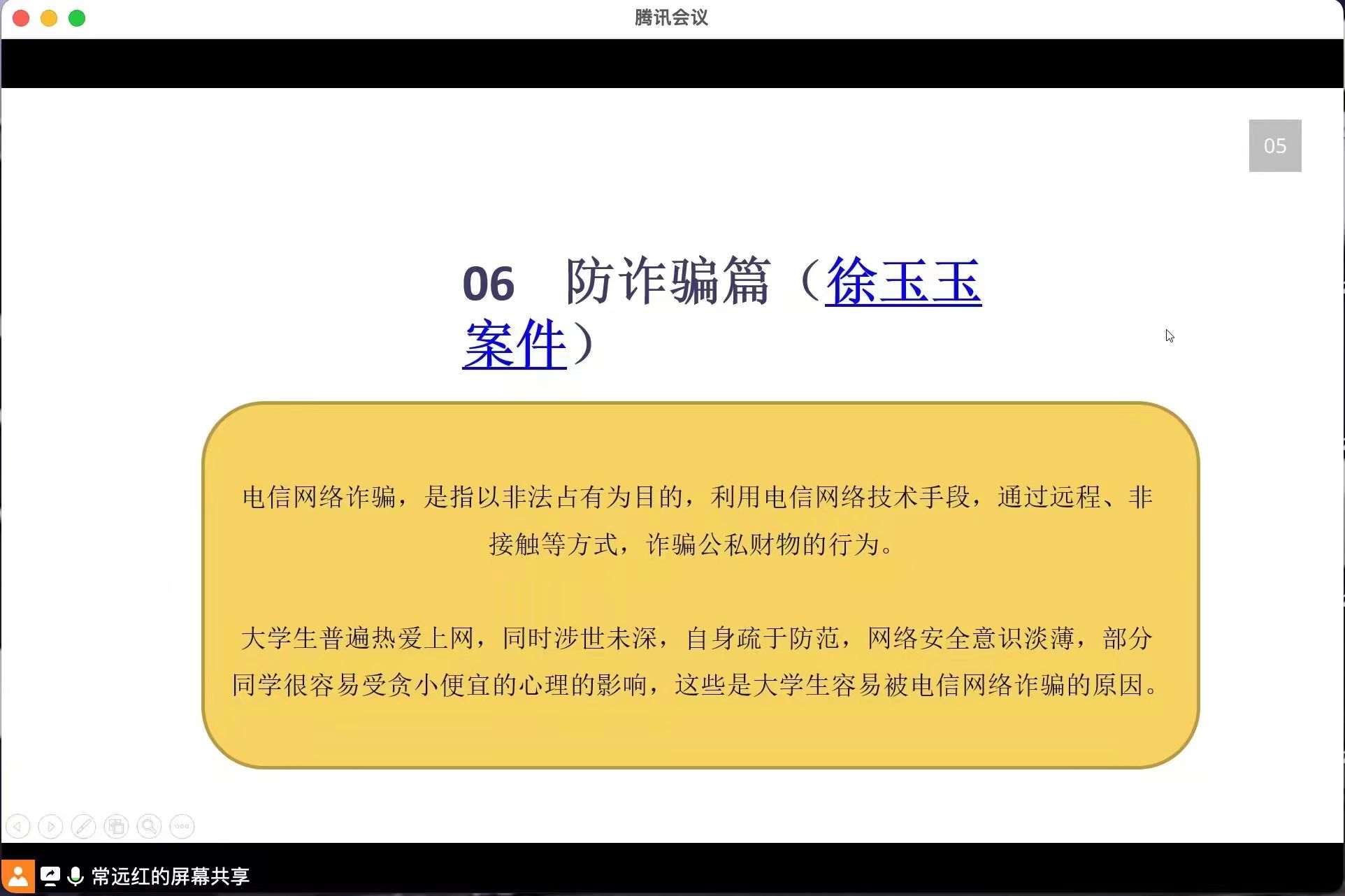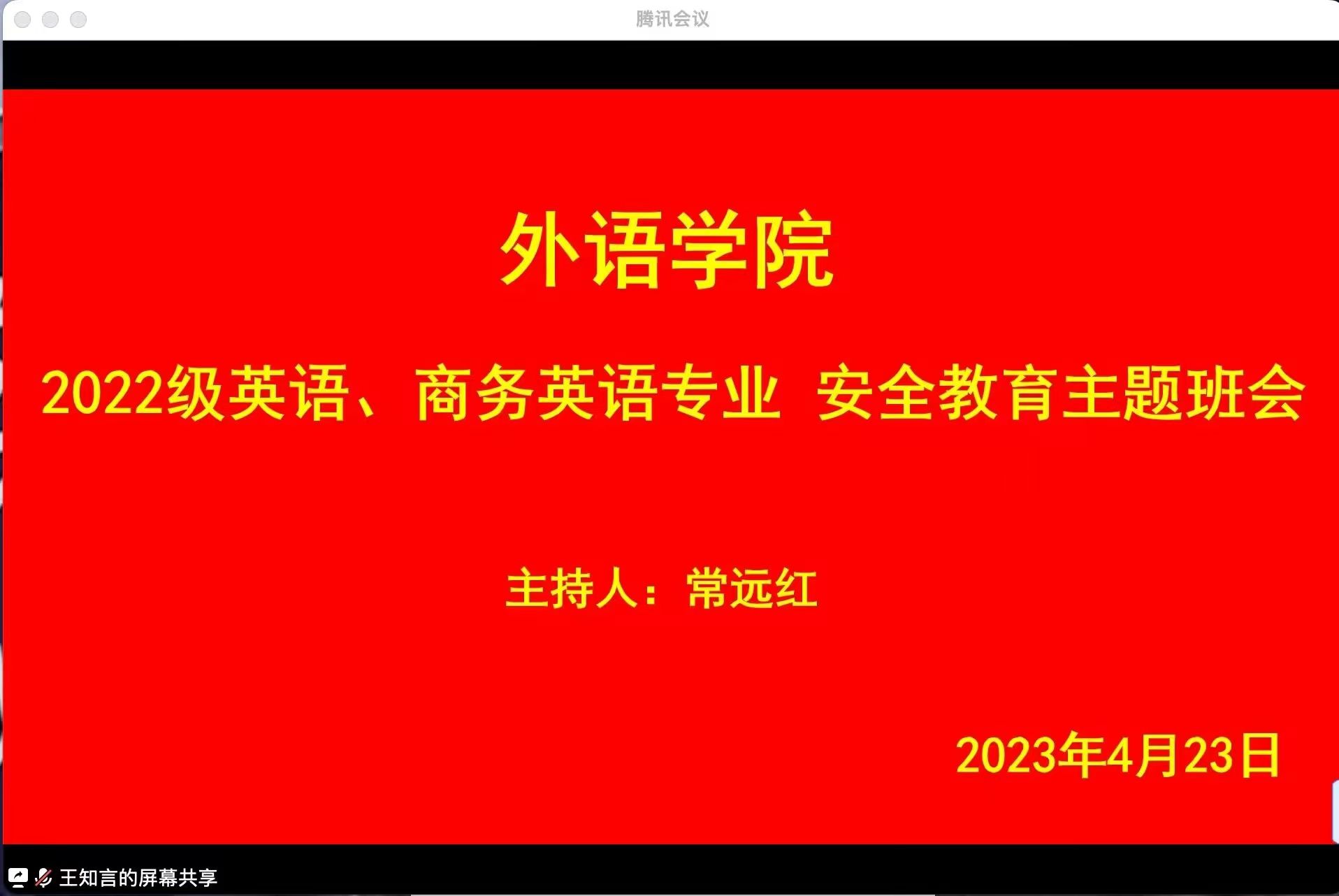为了增强威廉希尔中国官网老员工的安全防范意识,2023年4月23日晚上七点半,辅导员常老师通过腾讯会议召开了以“安全教育”为主题的班会,威廉希尔中国官网22级员工全员参与其中,本次班会开展的十分顺利。