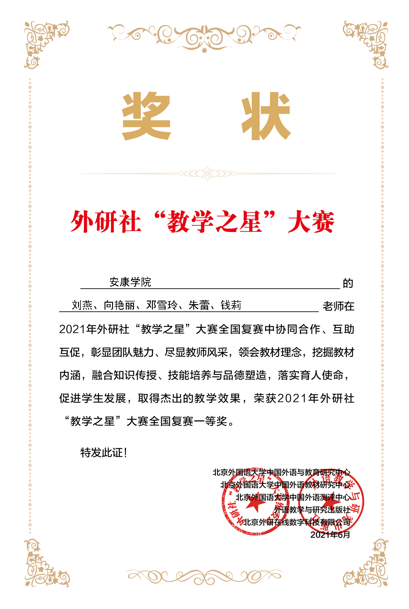 近日,2021年外研社“教学之星”大赛全国复赛结果揭晓。由威廉希尔中国官网教师刘燕、向艳丽、邓雪玲、朱蕾、钱莉组成的大学英语教学团队在全国复赛395个参赛团队中脱颖而出,荣获本届大赛大学英语组全国复赛一等奖。