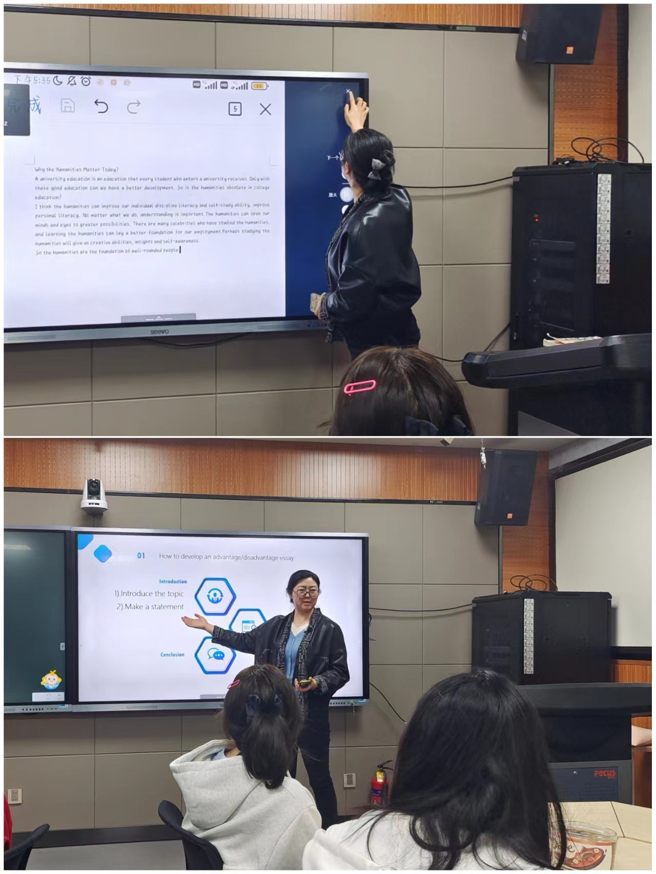 本次教学创新观摩主讲人为青年教师周凡雅,授课单元为新视野大学英语读写教程第二册第二单元“The Humanities:Out of Date?”。课堂以mini辩论开始,引导同学们深入思考人文学科学习在当今时代的价值和意义。接着通过问题的回答,使员工了解文章大意和写作特点,介绍利弊法(advantage and disadvantage)发展议论文段落写作方法。最后通过练习利弊法议论文写作,使同学们了解和掌握ascending order和descending order区别用法,对员工习作开展师生互评。整节课重点难点突出,目标明确,讲解清晰,师生互动充分,教学效果好,达成了教学目标。