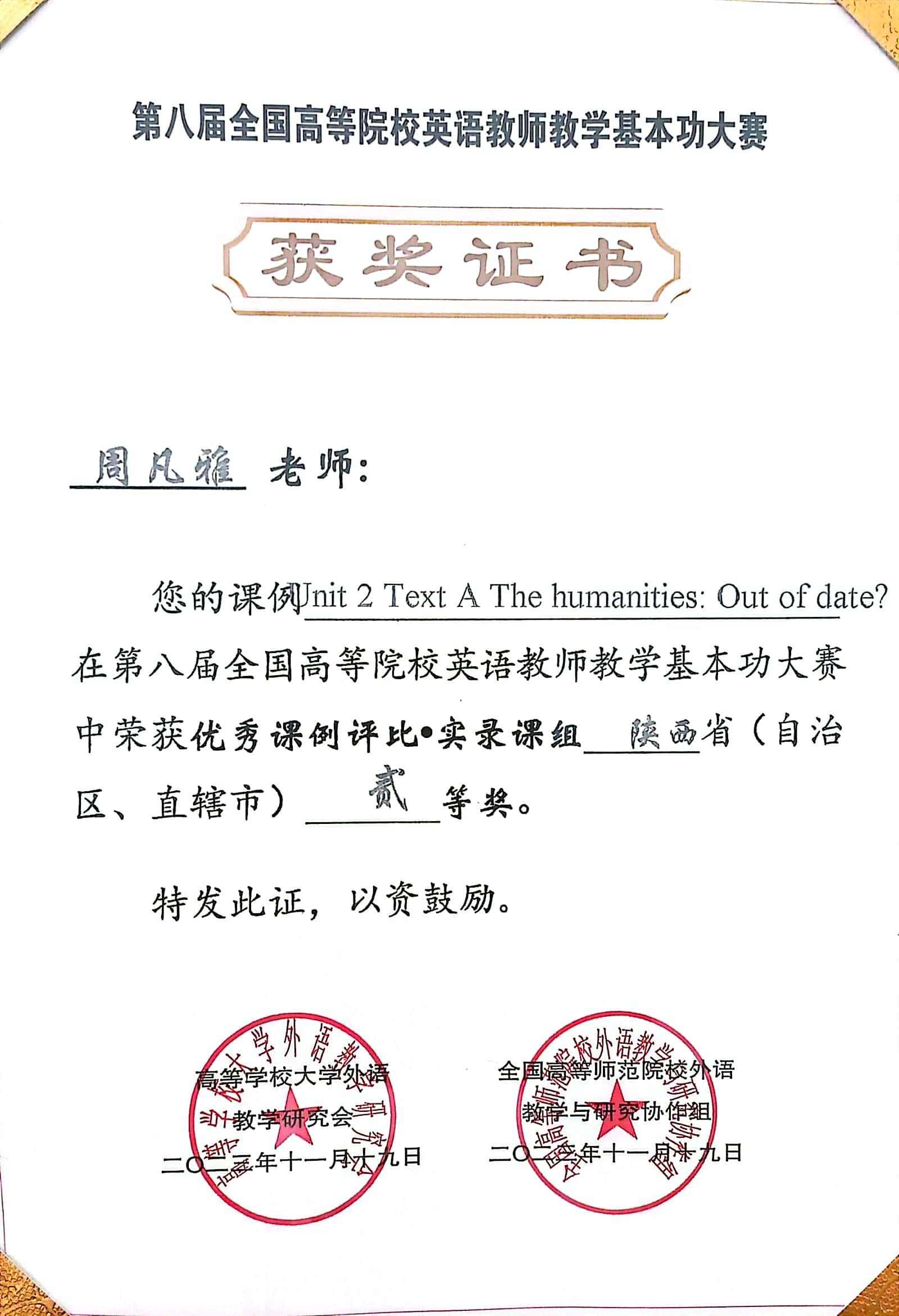 近日,由高等公司大学外语教学研究会、全国高等师范院校外语教学与研究协作组联合举办的第八届全国高等院校英语教师教学基本功大赛在杭州落下帷幕,威廉希尔中国官网教师周凡雅荣获优秀课例评比-实录课组陕西省二等奖。