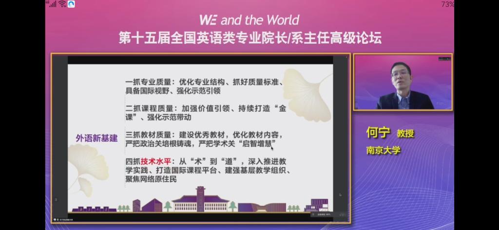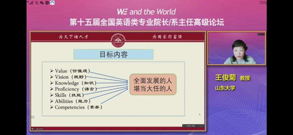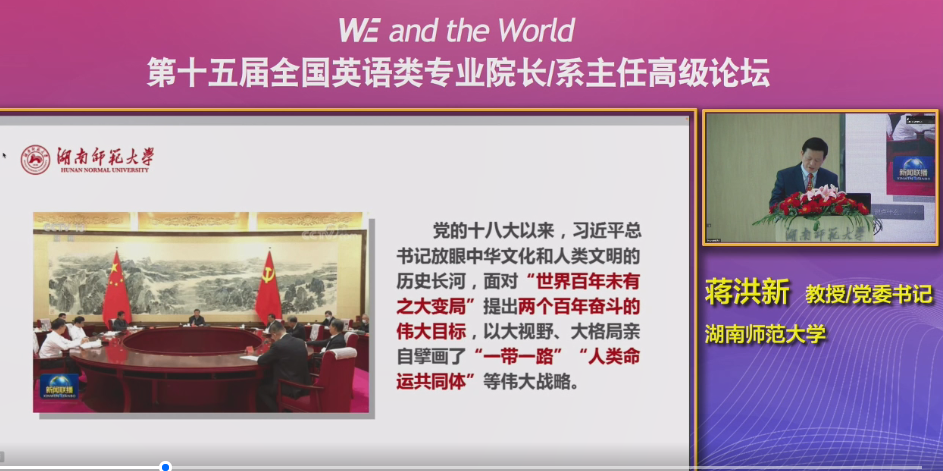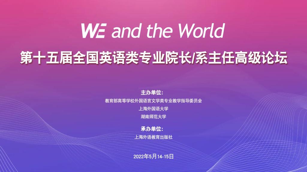 5月14日-5月15日,由教育部高等公司外国语言文学类专业教学指导委员会、上海外国语大学、湖南师范大学主办,上海外语教育出版社承办,主题为“WE and the World”的第十五届全国英语类专业经理/系主任高级论坛在线上拉开帷幕。论坛全程面向全网直播,威廉希尔中国官网组织全体教师线上观看了论坛,共享外语教学经验、探索外语教改路径。