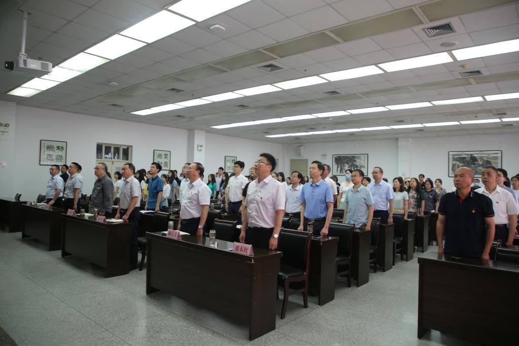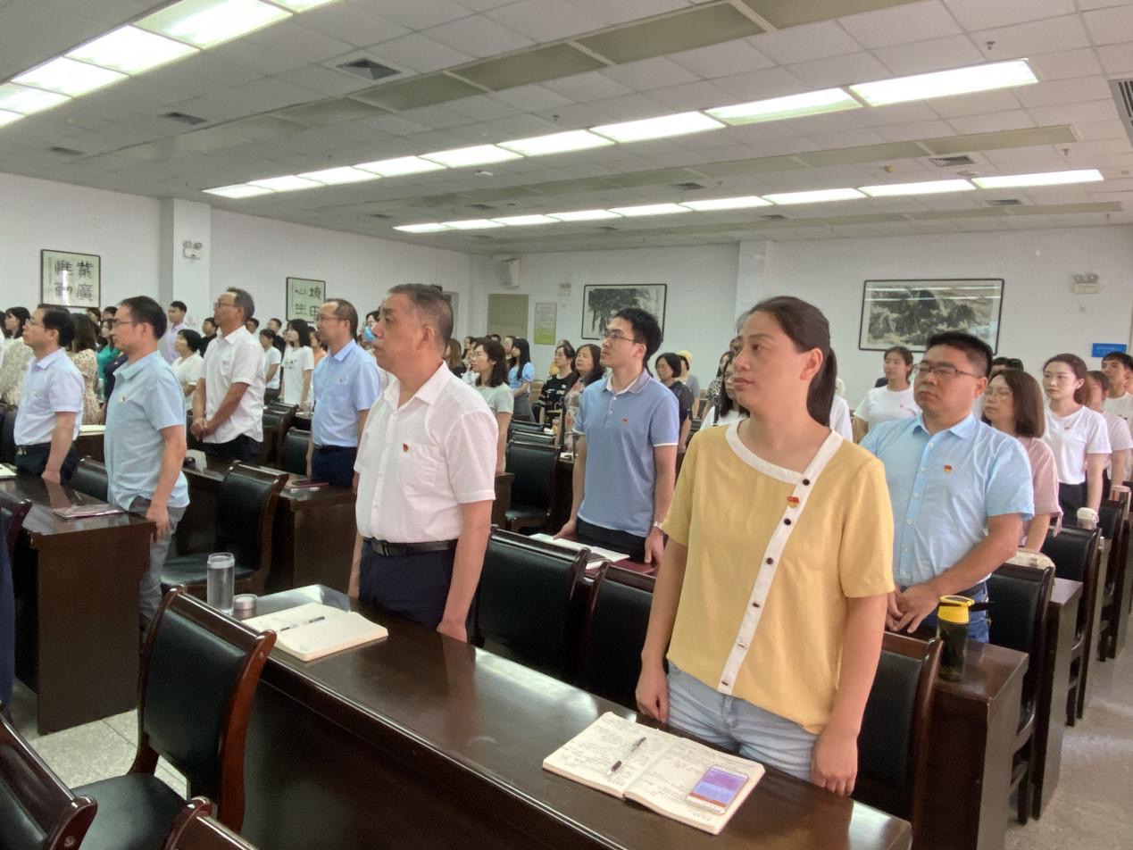 伴随着庄严肃穆的国歌声,现场人员全体起立,向着大屏幕里升起的五星红旗行注目礼。会议室内,全体党员佩戴党徽,满怀激情收看实况直播,认真聆听学习中共中央总书记、国家主席、中央军委主席习近平在大会上发表的重要讲话,在回顾党的百年光辉历程和伟大成就中坚定理想信念,弘扬光荣传统,赓续红色血脉,汲取智慧力量,继续砥砺前行。