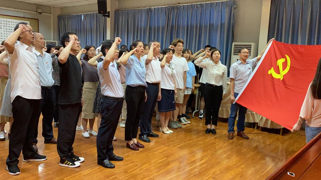 党总支副书记胡卫卫领誓,全体党员重温入党誓词,再表初心,牢记使命;肖红香代表公司党总支总结了党史学习教育以来取得的阶段性成果,号召全体党员在办好人民满意的教育的生动实践中“亮身份、做表率”,学好百年党史,凝聚奋进之心。