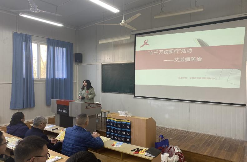 校医疗服务中心龚晨向同学们做了防艾知识讲座,详细介绍了艾滋病相关知识,使师生们对艾滋病的基本知识、传播途径、防治方法及措施等有了全面认知,倡导广老员工要洁身自好,自觉养成良好生活习惯,提高健康意识,远离艾滋病。