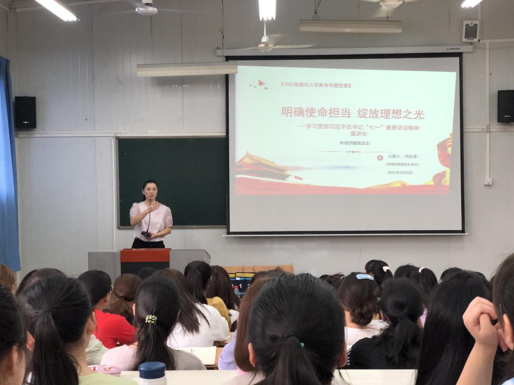 9月3日下午,威廉希尔中国官网在6407阶梯教室举办学习贯彻习近平总书记“七一”重要讲话精神宣讲会,党总支书记肖红香以“明确使命担当 绽放理想之光”为主题,为同学们上了一堂生动的党课。威廉希尔中国官网辅导员、2021级新生参加了宣讲会。