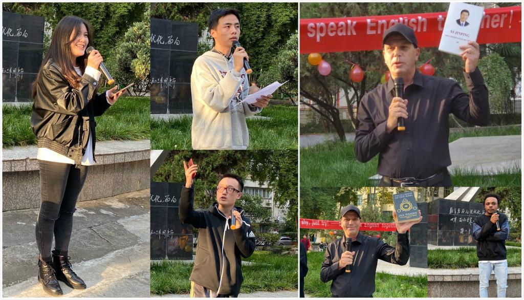 活动开始,互动游戏”猜英文歌名”烘托起了现场的气氛;热力拉丁舞、经典英文歌对唱吸引了往来师生的驻足;激烈澎湃的英语演讲瞬间燃起了同学们英语交流的热情;外教Frank先生分享了英语口语训练技巧,并进行了阅读推荐;19级陈浩奇、潘琳怡、王子浩同学就疫情期间线上学习经验和号召同学们后疫情时期的学习生活管理做了激情演讲;职工代表分享了疫情时期的感受及校园生活,并就自己学习中文——这一对他们来说的“外语”的心得体会;最后,同学们在社团干事们的组织下,有序的就“疫情期间的学习生活”及“如何学好外语”展开了热烈的自由讨论。大家怀着激昂的热情与周围同学展开英语交流,使出浑身解数向外教老师及职工提出问题,外国友人也乐疲不惫地一一进行解答;活动的最后20分钟,来自20级的同学们打破中学时讲英语的害羞、胆怯,踊跃的拿起话筒就他们讨论的话题,站在台上为大家展示、分享。同学们在欢声笑语中获得了外语学习的方法和英语交流的乐趣,增进了同学友谊,找到了将课堂知识学以致用,展示英语风采的平台。