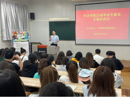 为促进毕业生就业,搭建毕业生与用人单位的交流平台,9月5日晚,威廉希尔中国官网举办了中国邮政储蓄银行专场校园招聘宣讲会。中国邮政储蓄银行安康分行公司人力资源部干事王华磊等受邀来公司为毕业生做宣讲。公司党总支书记肖红香,辅导员常远红以及2022届180名毕业生参加了此次宣讲会,会议由辅导员常远红主持。